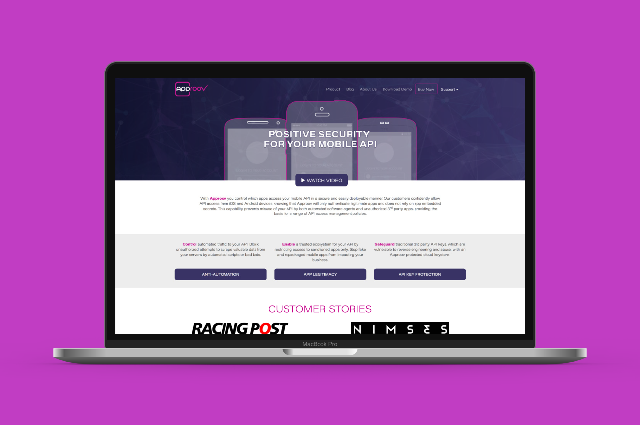 Approov is an app authentication software created by Critical Blue. The brief was to create the branding for Approov (20/20 Productions formulated the name as well as providing the branding service), as well as creating a website, PPTX and Word Templates, branded screen cleaners, set of icons, explainer video and infographics. As well as providing these elements, the brand guidelines also needed to be written and supplied so that the Approov team could amend the website themselves in the future.