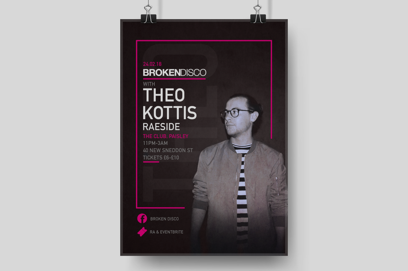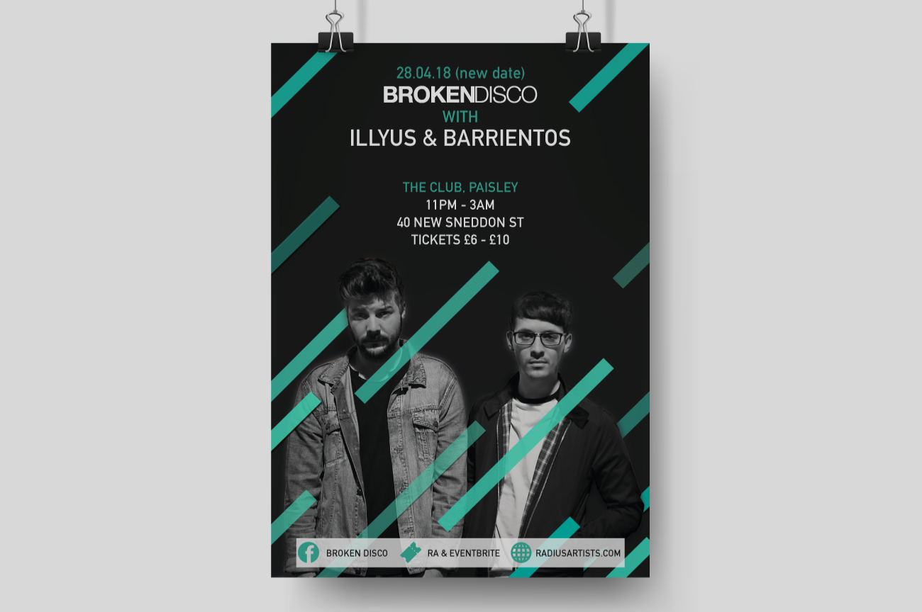 Broken Disco are a DJ duo within the underground house music genre, based in Glasgow with sets both locally and abroad. Some of the design work produced my myself, includes printed posters, social media graphics, animated GIFs, online ads and gig branding.